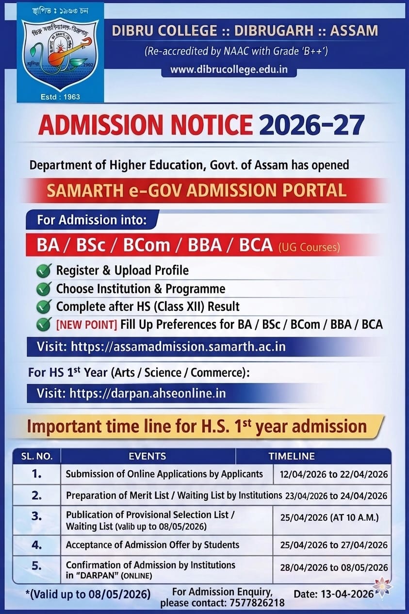 EXAMINATION NOTICE {2nd, 4th and 6th Semester (NEP) (FYUGP) Examination, 2026}March 23, 2026Notice inviting quotationApril 20, 2026 Admission Notice 2026-27 April 13, 2026 Share Related postsApril 20, 2026Notice inviting quotationRead moreMarch 23, 2026EXAMINATION NOTICE {2nd, 4th and 6th Semester (NEP) (FYUGP) Examination, 2026}Read moreFebruary 25, 2026Examination Notice (2nd, 4th, 6th semester CBCS examination 2026Read more